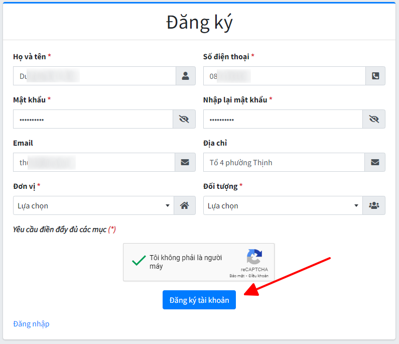 Truy cập trang chủ, lựa chọn chức năng “Đăng ký”. Tại đây người dùng điền các thông tin cá nhân sau đó nhấn “Đăng ký tài khoản” để khởi tạo tài khoản.