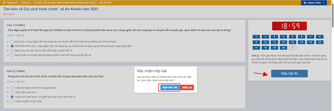 Thí sinh tích chọn vào đáp án mà mình cho là đúng để trả lời. Khi trả lời xong tất cả các câu hỏi, thí sinh nhất nộp bài để trả lời thêm câu hỏi phụ.