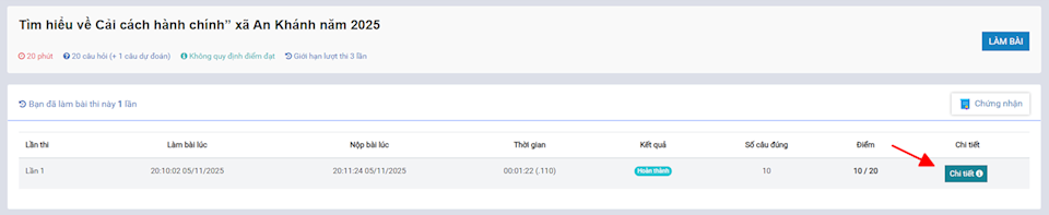 Sau khi đã làm bài xong, nhấn vào mục chi tiết để xem bài thi của mình.